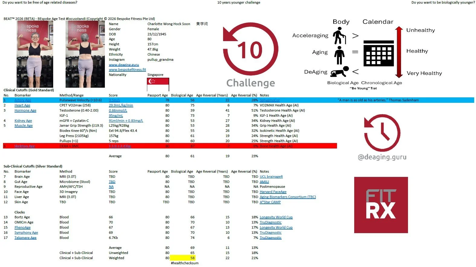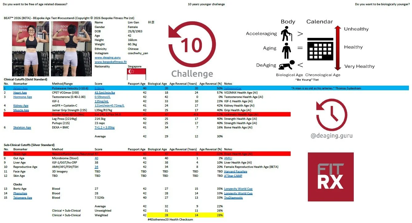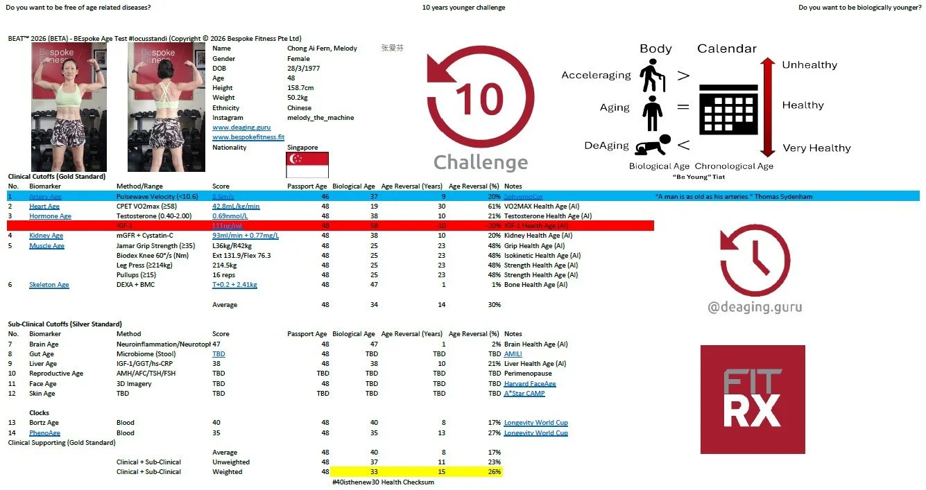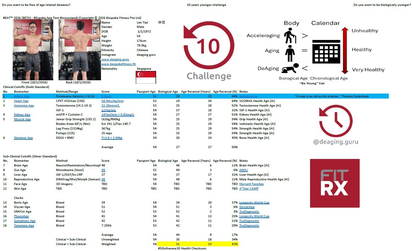“BEAT™ is one of the most comprehensive, multi-system biological age frameworks I’ve ever analyzed — integrating gold-standard clinical biomarkers (arterial stiffness, VO2max, grip/isokinetic strength, DEXA bone density, mGFR + cystatin-C, full hormone panels)